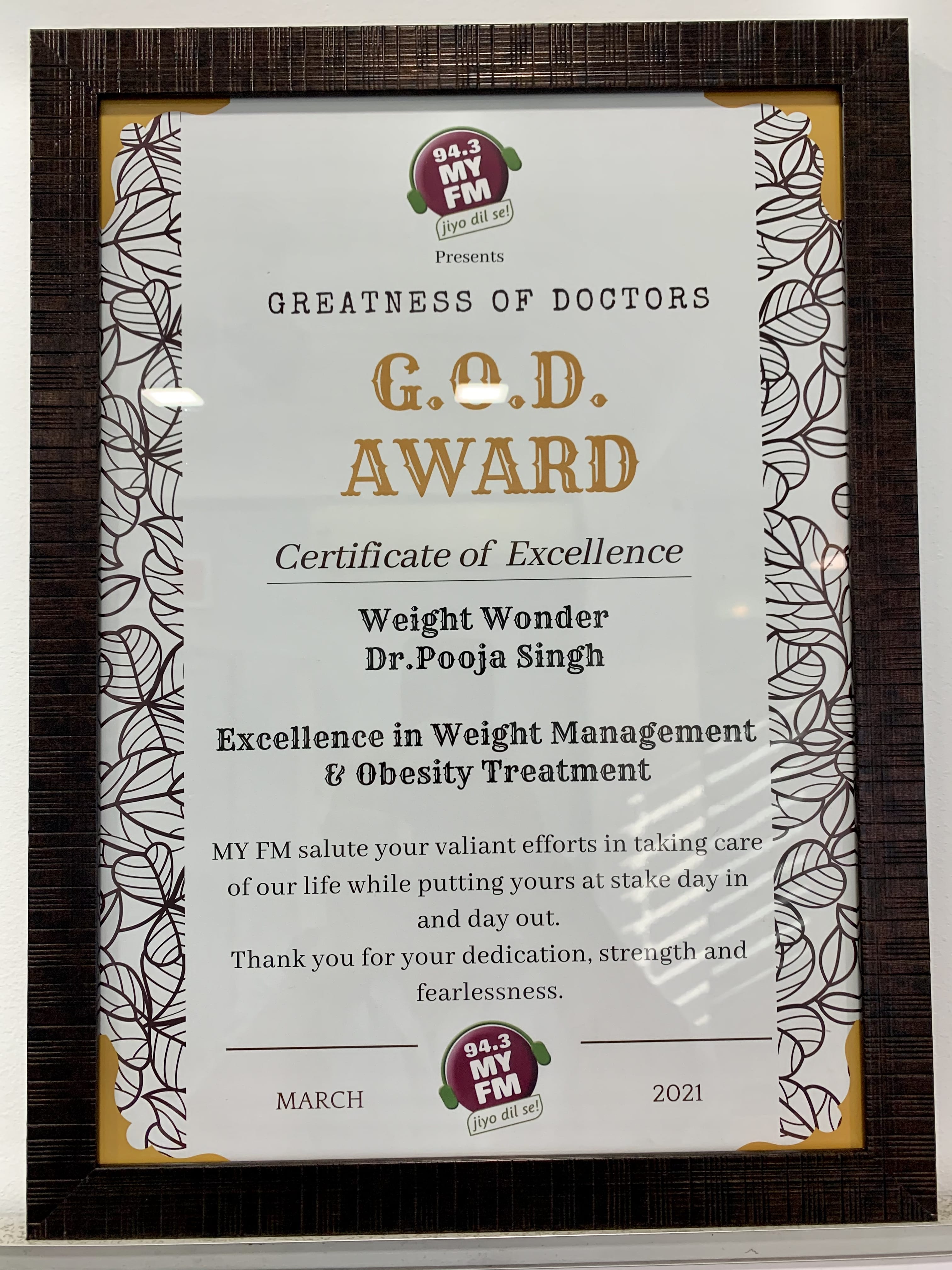 One more feather to our cap. We received G.O.D. Awards by MyFM for “Excellence in Weight Management & Obesity Treatment”. Thanks to all the support from our members